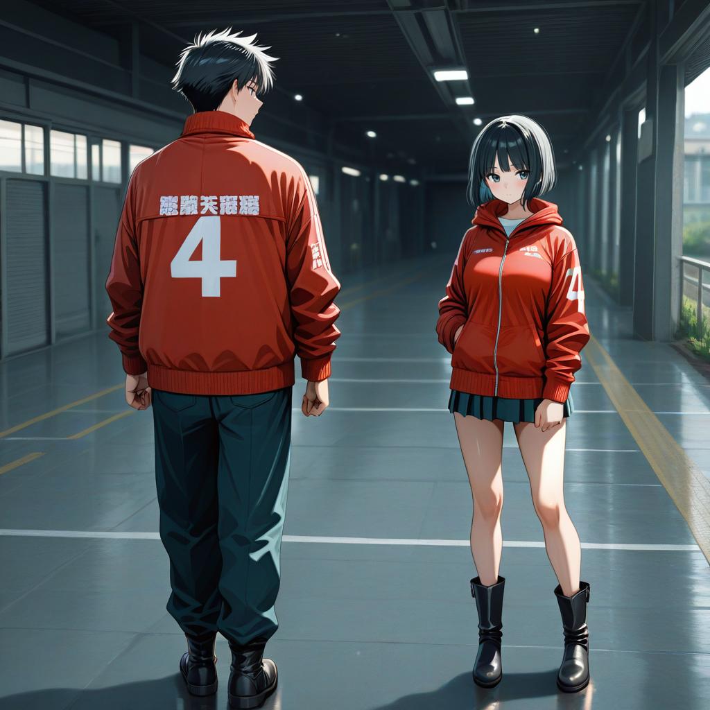 Digital artwork of two anime style characters standing in a modern hallway. The male character with short black and white hair wears a red jacket with white numbering and dark pants. The female character has short black hair, wears a red zip-up jacket, a short pleated skirt, and black boots. Both jackets display white Japanese text and the number 4.