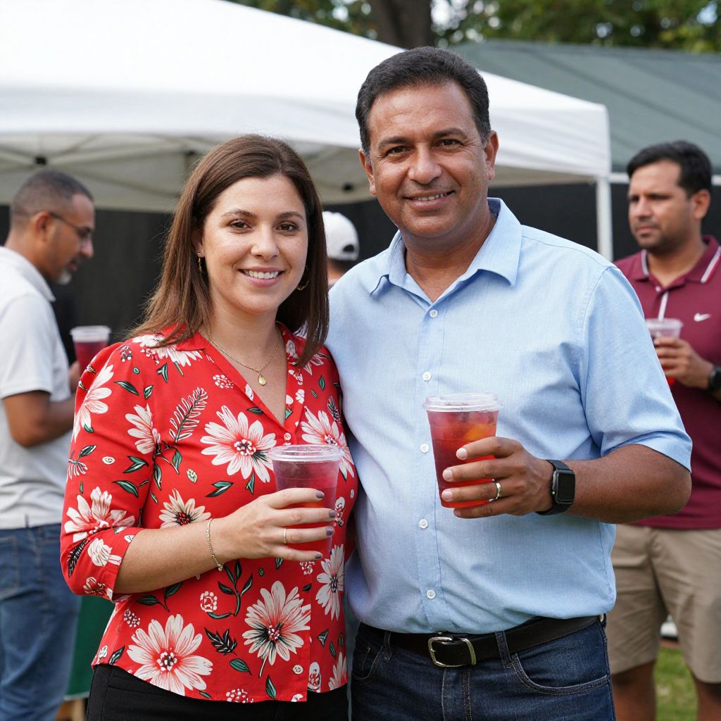 Two individuals, a woman in a red floral shirt and a man in a light blue button-up shirt, stand together outdoors, smiling and holding plastic cups filled with red beverages, surrounded by other people and a white tent in the background.