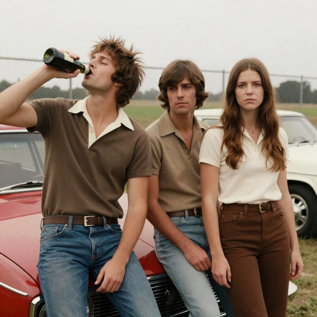 Photograph of three people in 1970s-style clothing. Two sit on a red vintage car hood, one standing beside it. The person on the left drinks from a bottle, spiky hair. The middle person, with short brown hair, looks forward. The person on the right, with long brown hair, stands with a serious expression. Background: chain-link fence, green fields. Two vintage cars. Red car hood, white car in background.