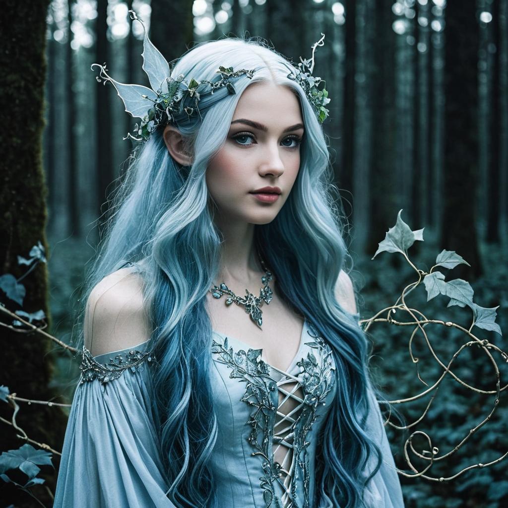 Drawing with colored pencils in magical realism of a refined woodland enchantress entwined with frosted blackberry vines, set against the backdrop of a snow-dusted pine forest clearing in early dawn, featuring icy alabaster skin, long shining raven hair framing pale gray eyes, with elements of winter naturism fused with dark allure, showcasing crisp cold shine, and cold, quietly seductive, with and a touch of arctic necrostyle, Witch_Northern_Forests