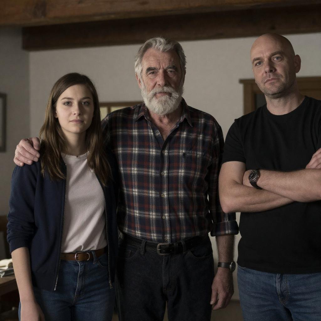 Photograph of three people in a dimly lit room. An older man with a white beard and plaid shirt stands in the center, his arm around a young woman with brown hair and a navy jacket on the left. A bald man with a black shirt stands to the right, arms crossed. Background includes wooden beams and a white wall.