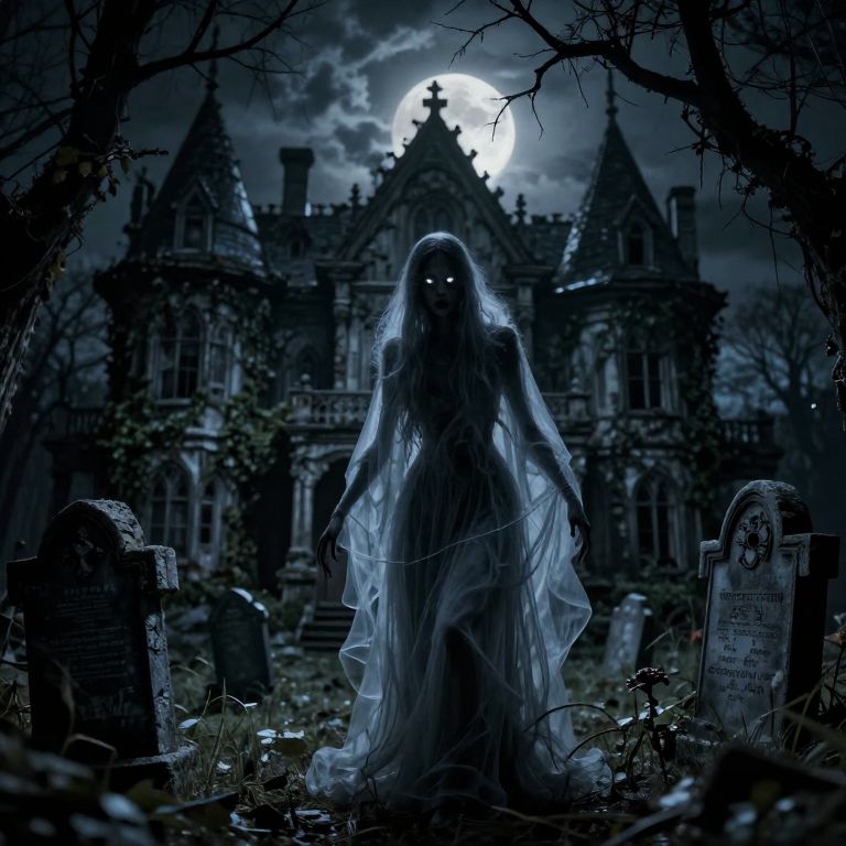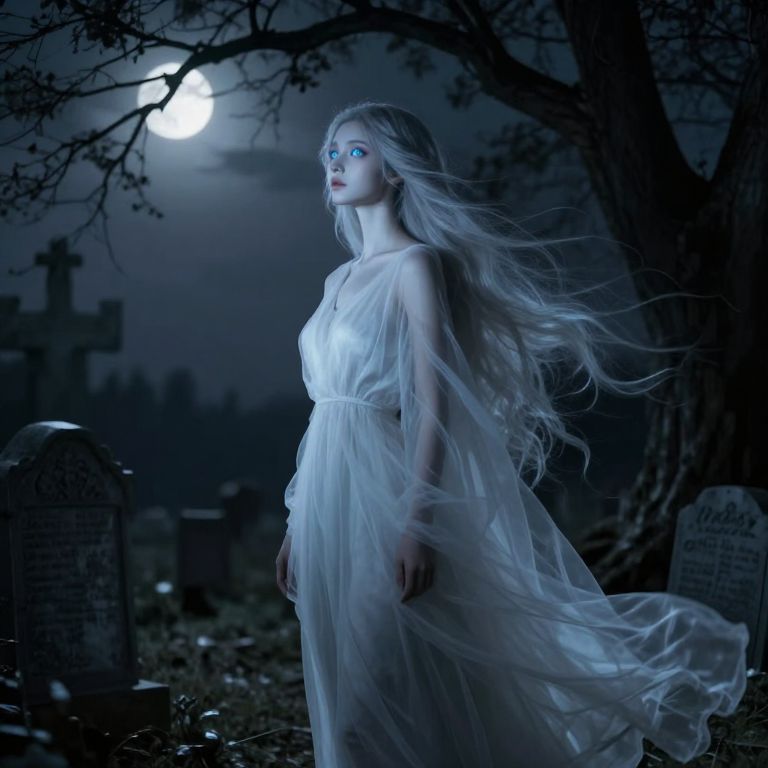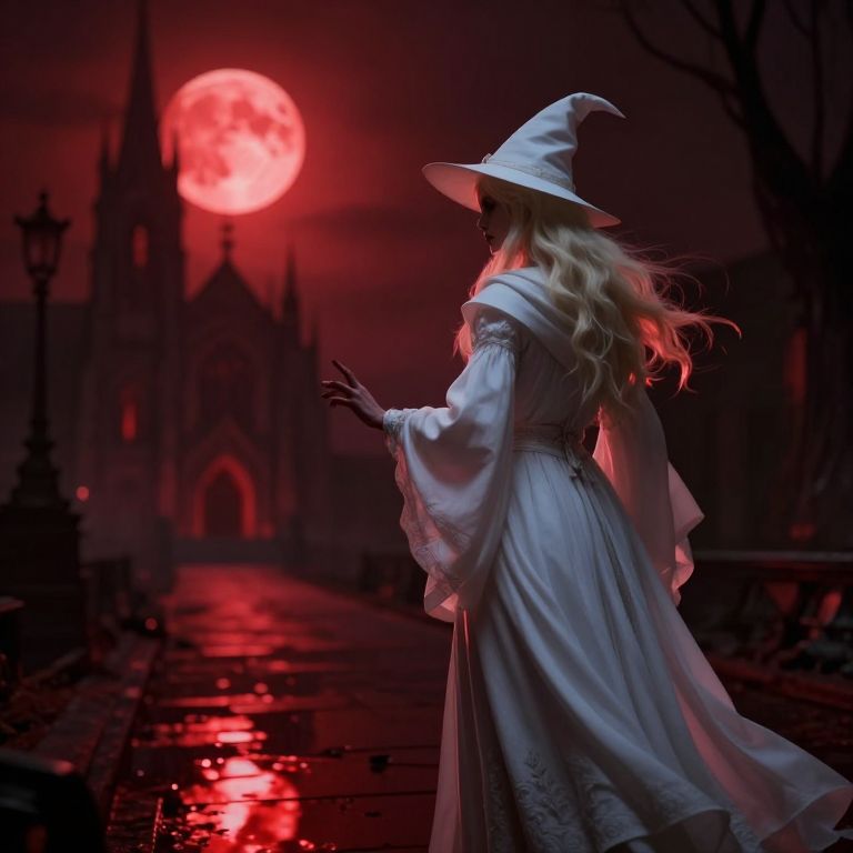 Photograph-style digital art depicts a mysterious blonde woman in a white, flowing witch's dress and pointed hat, facing away. She stands on a wet, reflective path under a red, glowing full moon. Gothic-style castle silhouettes are visible in the background. The woman's long hair cascades down her back, and she raises her gloved hand slightly. The scene is bathed in eerie red and black hues, creating a spooky, enchanting atmosphere. The path reflects the moon's red light, enhancing the mystical, supernatural feel of the image.