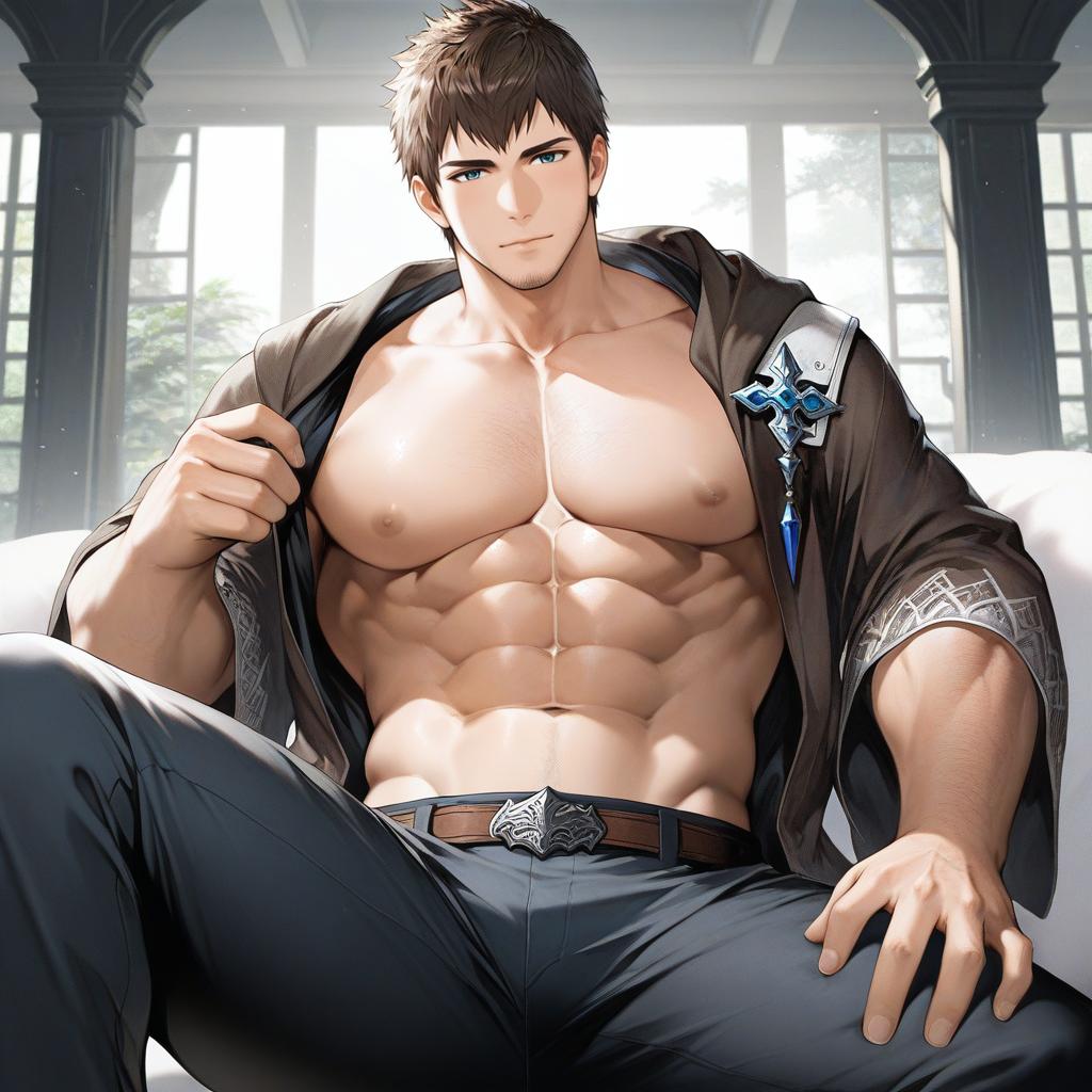 Ardbert hylfyst, final fantasy, 1boy, mature male, blue eyes, short hair, brown hair, hyur, bara, muscular male, stubble, large pectorals, abs, by artist haori io, illustrious