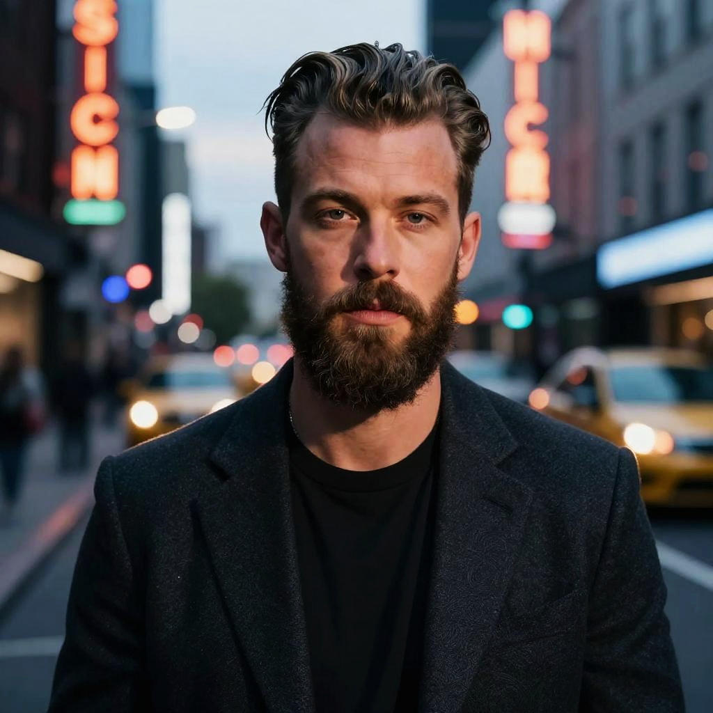 Calvin Harris beard and hairstyle, fashionable man with a sharp, full beard and slicked-back hair, vibrant city street at dusk, neon lights reflecting, photorealistic, cool and confident expression