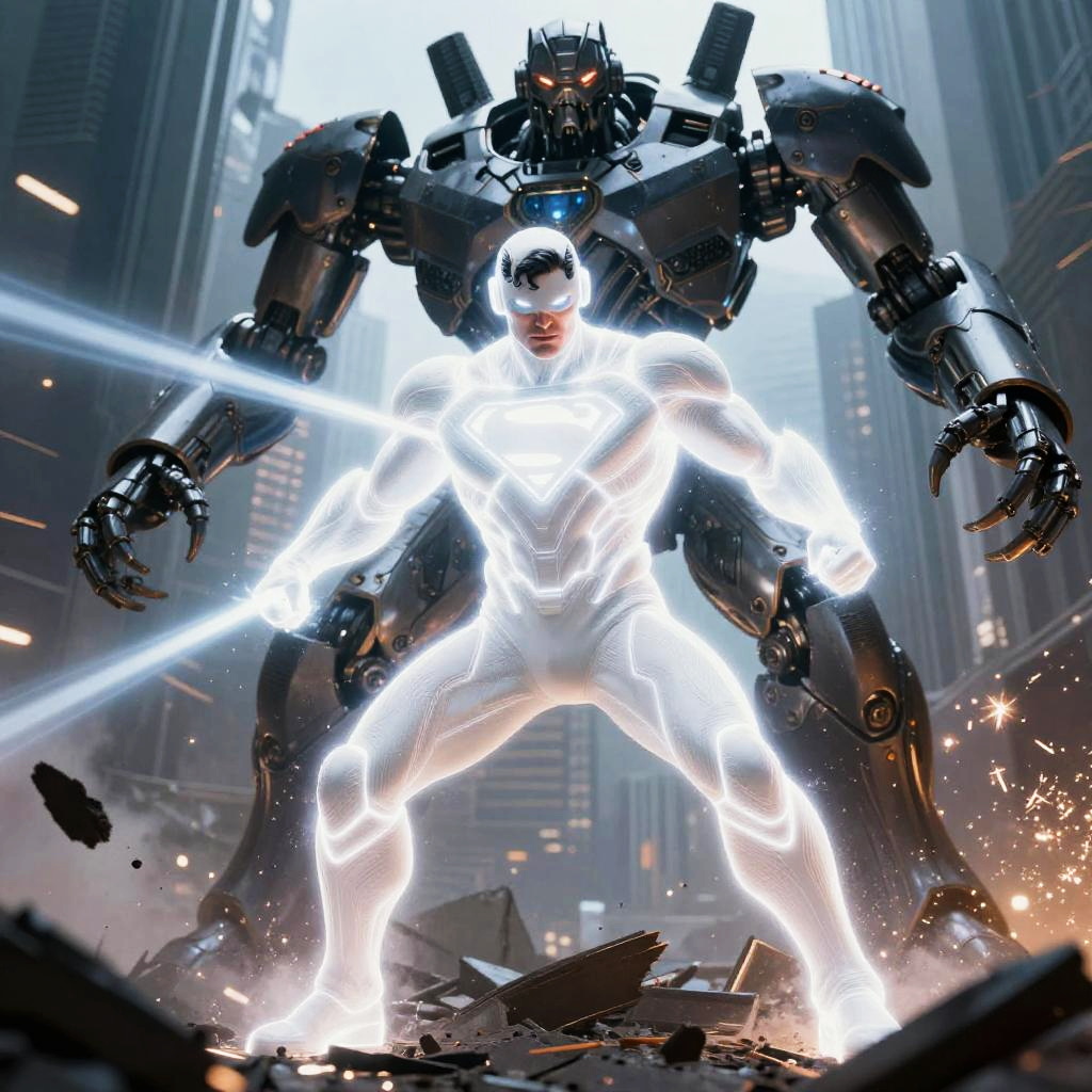White suit Superman battling a giant mechanical creature in a ruined futuristic city, dynamic action scene with sparks and debris, glowing white suit radiating energy beams, intense color contrast between white and dark metallic elements, cinematic action style