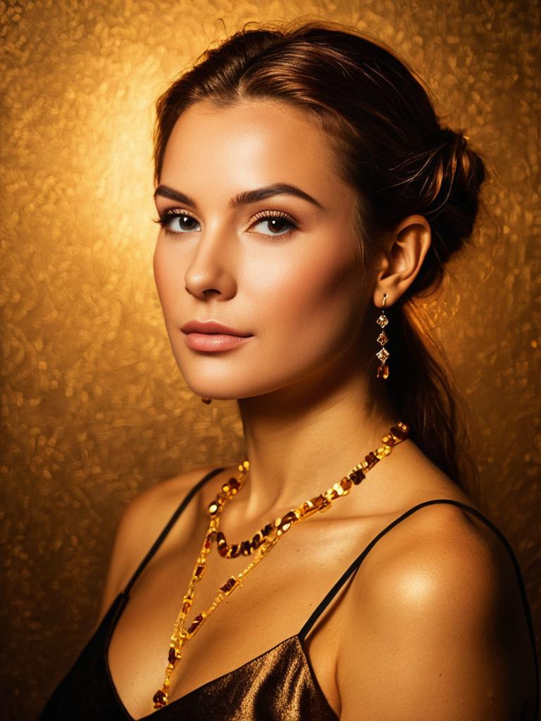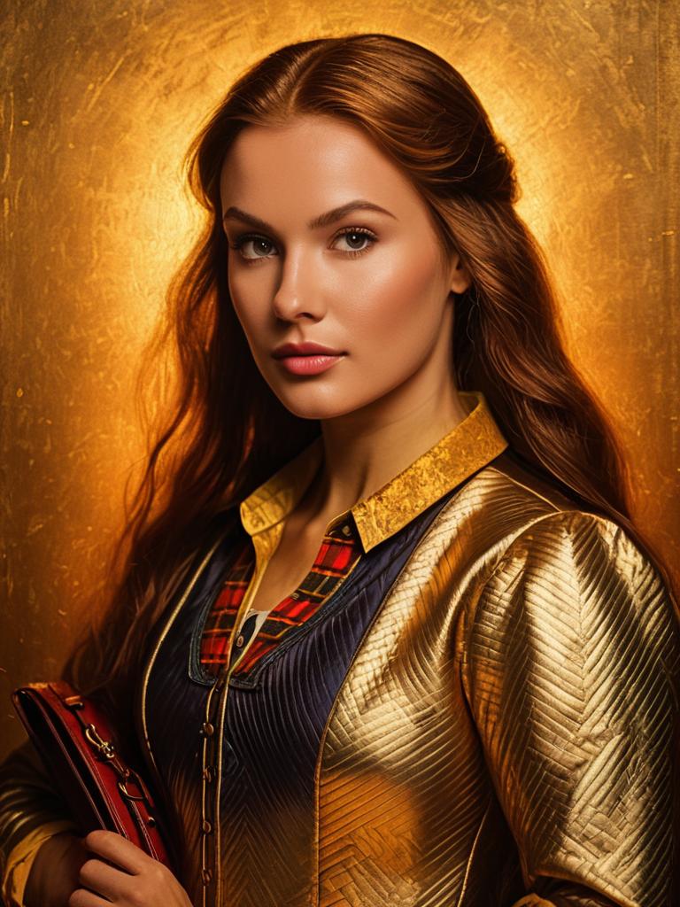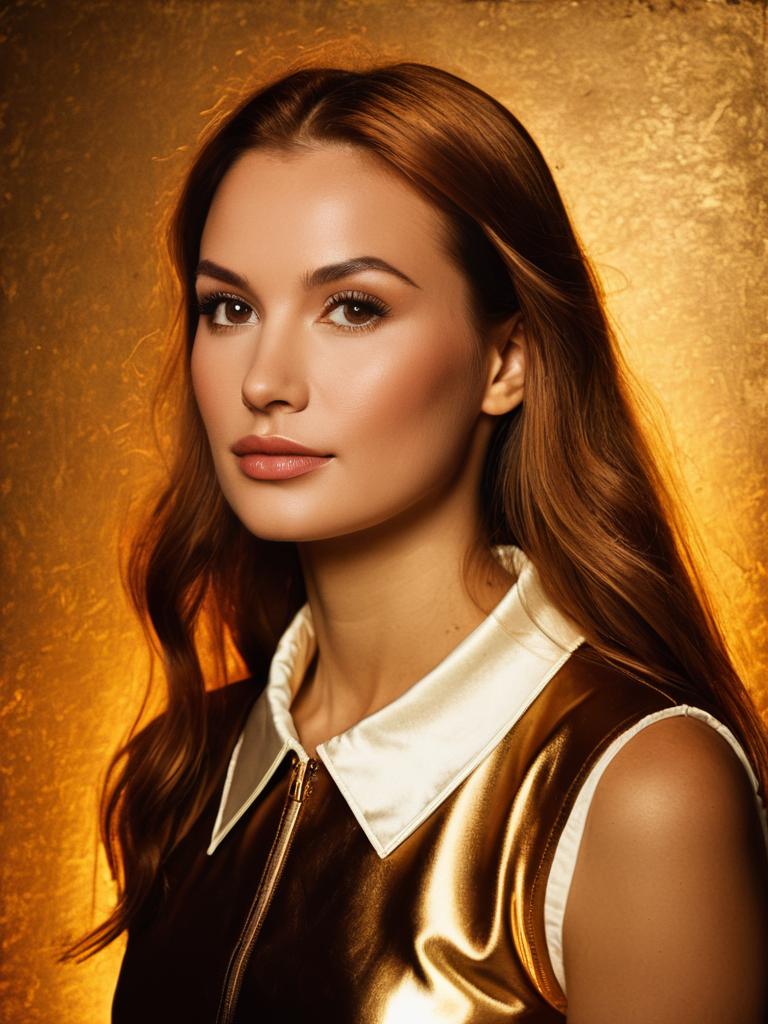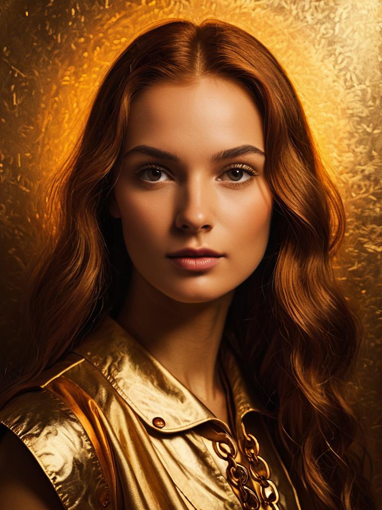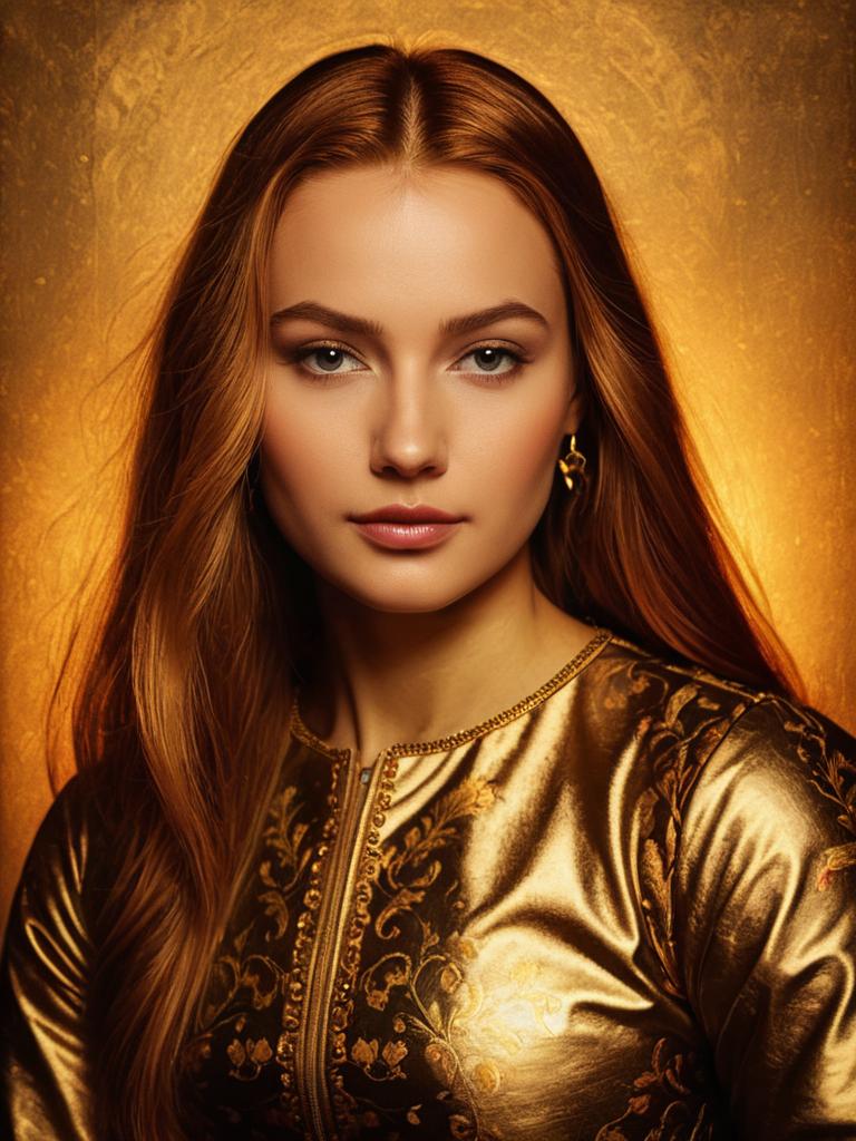 Close-up portrait of a woman with long reddish-brown hair wearing an ornate gold dress with intricate floral patterns. She has light skin, gray eyes, and is accessorized with small gold earrings. The background is a warm golden texture that complements her outfit.