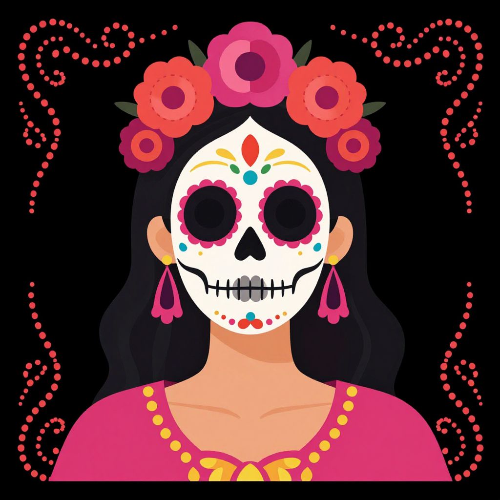 A vibrant vector illustration featuring a woman adorned with a Sugar Skull or Calavera Catrina makeup, set against a stark black background framed by dotted red swirls, evoking the festive spirit of Mexico's Day of the Dead celebration.