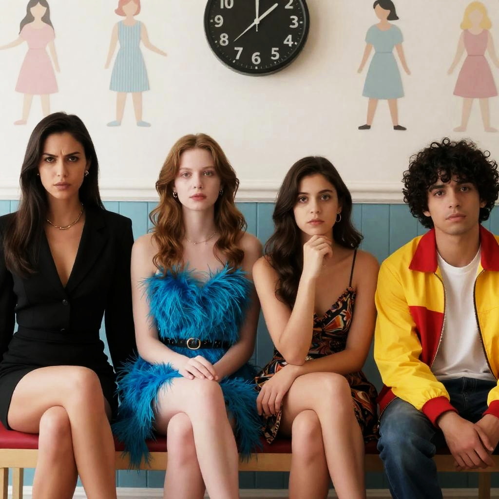 Photograph of five people in a bar. Foreground: woman with wild blonde hair, red lipstick, black leather jacket, sucking lollipop. Next to her, woman with black hair, black leather jacket, red lipstick, sucking lollipop. Table with four colorful drinks. Background: three men, one with dark hair, one with curly hair, one with mustache, looking at the camera. Light beige wall.