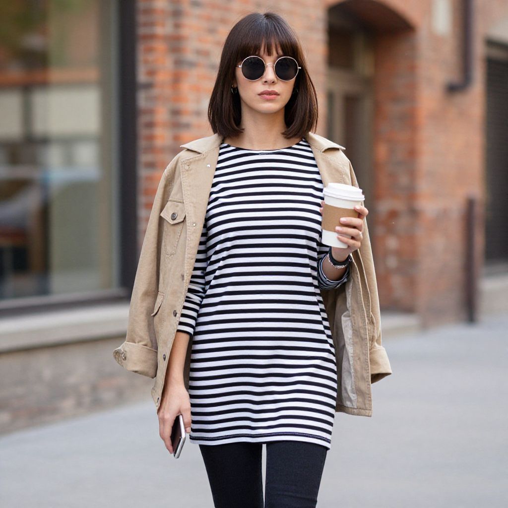 "Woman, casual streetwear, black and white horizontally striped t-shirt dress, long sleeves, round neckline, tan lightweight button-up jacket with rolled-up sleeves, dark skinny jeans, ankle-grazing length, rounded sunglasses with dark tint, mid-parted hair with bangs, holding a paper coffee cup, smartphone, visible wristband, urban street with brick buildings background.. Sexy. Pretty face and beаutiful eyes. Big breasts."