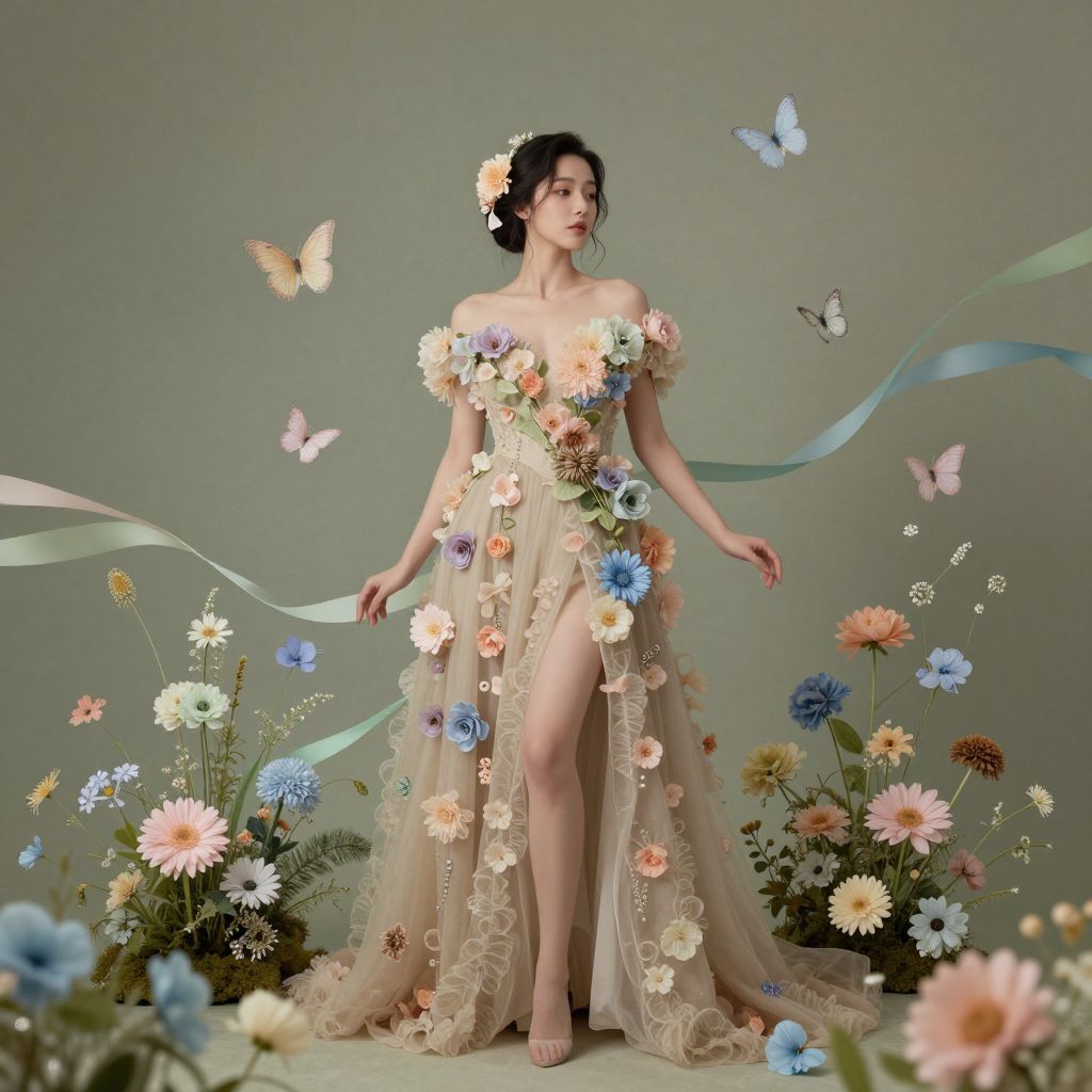 A hyperreal, high-detail image of a woman in a beautiful beige gown adorned with pastel flowers, surrounded by floating Japanese ambiance, flowers, ribbons in muted greens, pinks, and blues, and pastel butterflies, all in an 8k full-length scene.