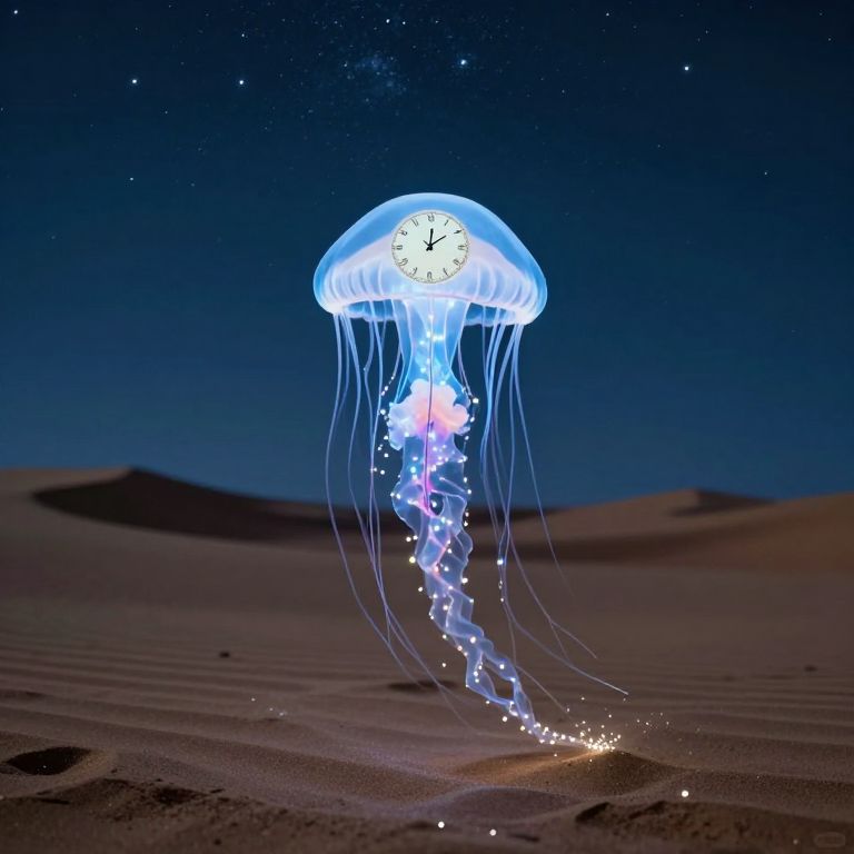In a surreal desert under a starlit sky, a luminous jellyfish adorned with a clock face drifts serenely, its rhythmic contractions casting trails of sparkling sand that weave into celestial patterns, symbolizing the delicate dance between time and eternity.