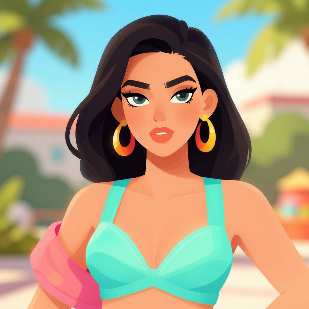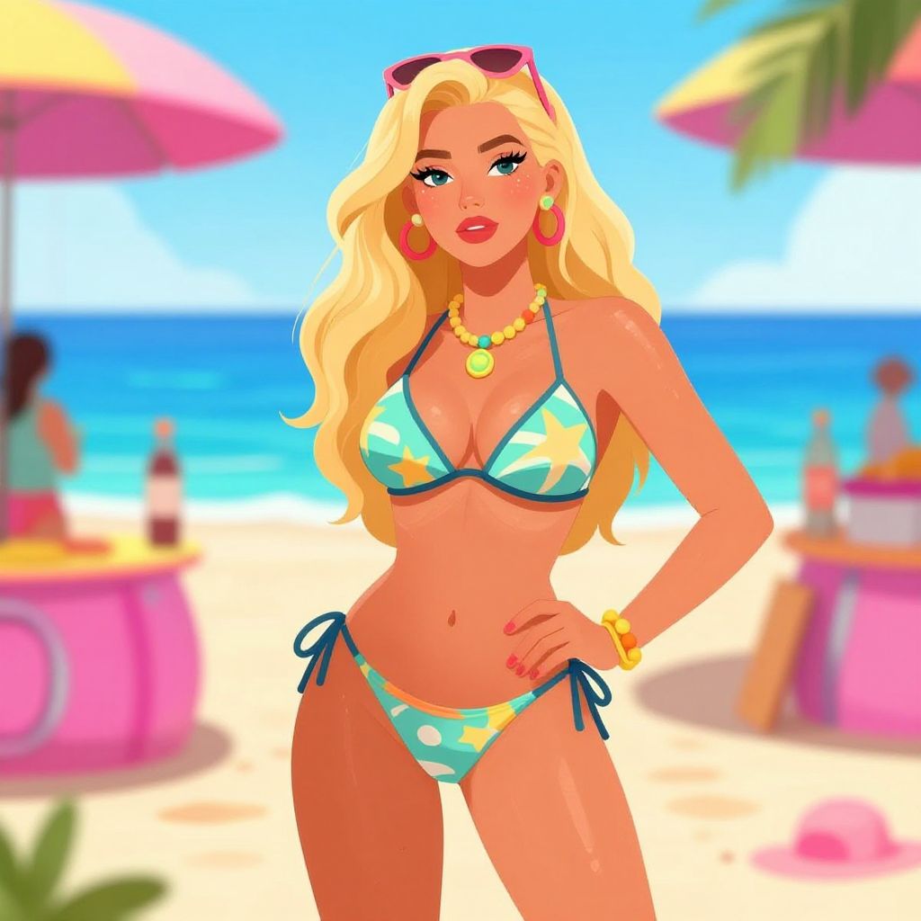 Blonde bimbo posing at a beach party, wearing a stylish bikini and playful accessories, with sun-kissed skin and a bright blue ocean background, fun and colorful illustration