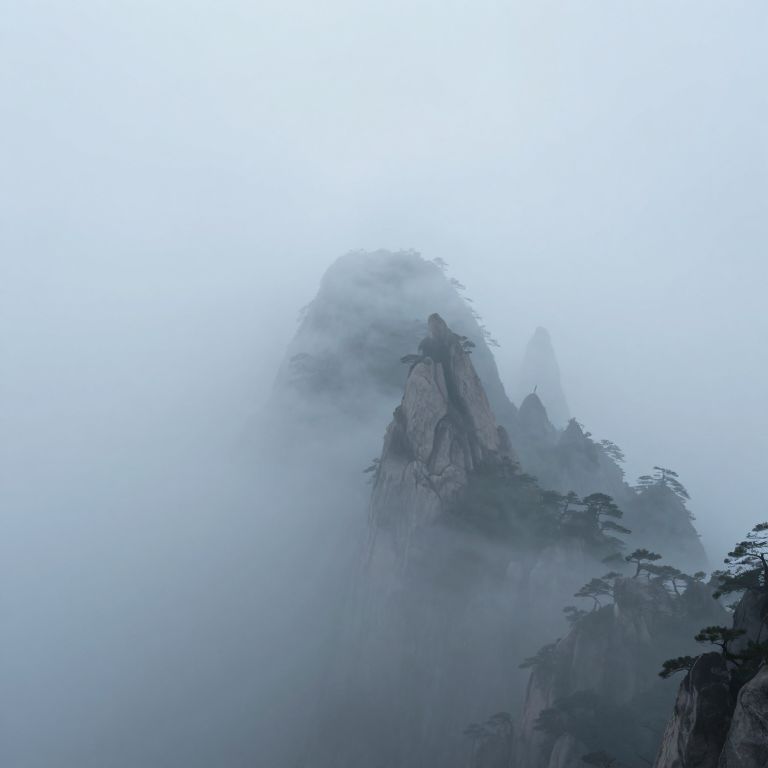 Photograph of a misty mountain landscape. Jagged rock formations rise through dense, white fog, partially obscuring the peaks. Sparse, dark green pine trees cling to the rocky surfaces. The image has a cool, blue-gray color palette, with the fog creating a soft, ethereal atmosphere. The composition focuses on the contrast between the dark, textured rocks and the smooth, misty background, evoking a sense of mystery and tranquility.