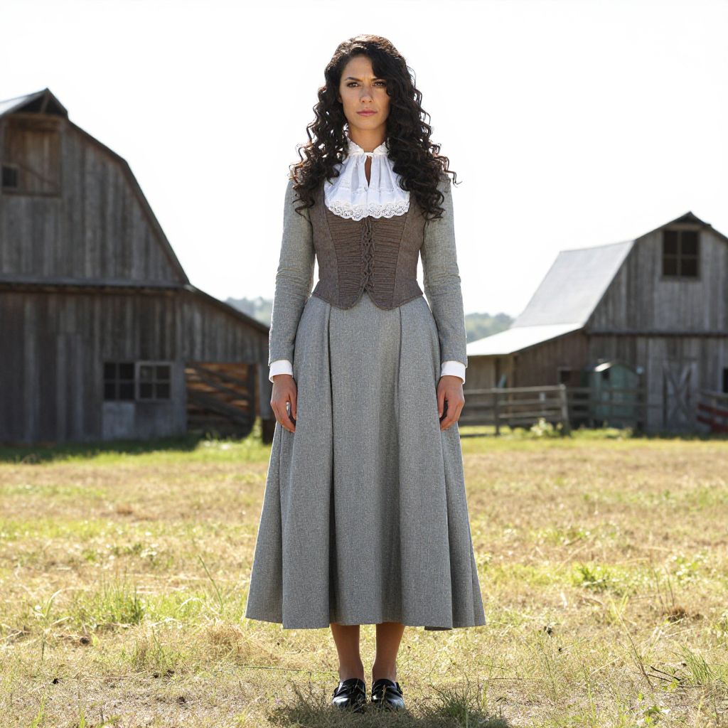 Photograph of a woman with long curly black hair, wearing a gray Victorian-style dress with white lace collar, standing in a grassy field with rustic