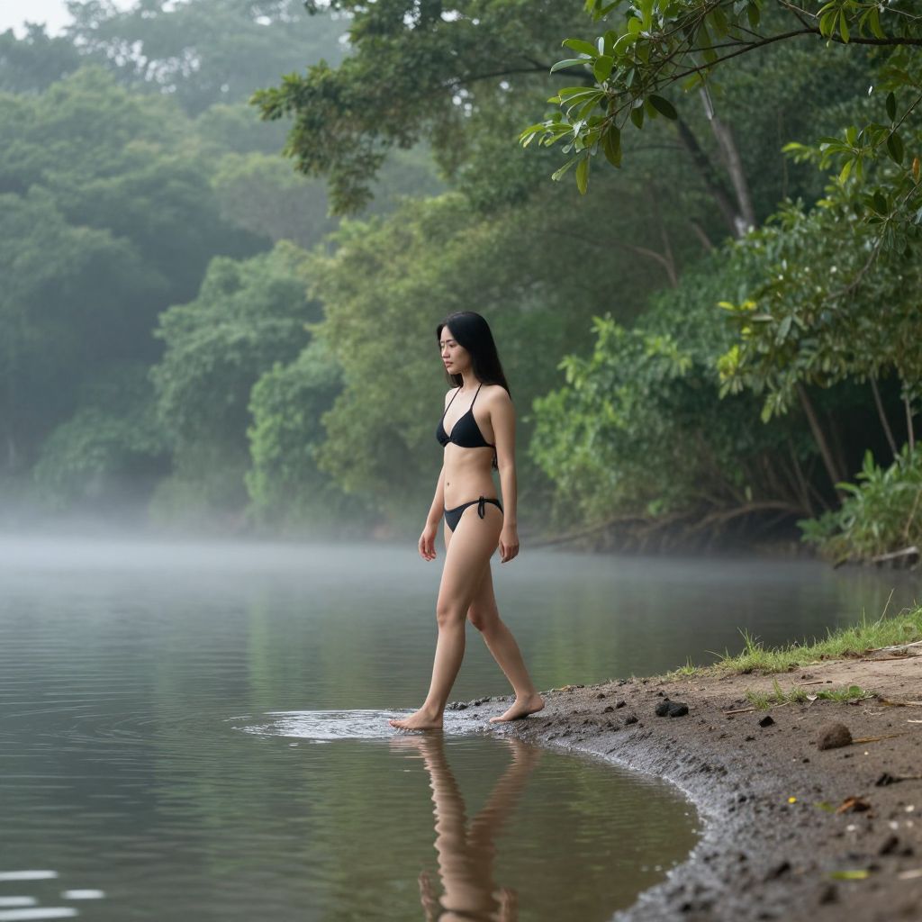 Photograph of a young woman with long black hair walking along the edge of a misty, serene lake. She wears a black bikini with a triangular top and low-rise bottoms, revealing a slim, toned physique. Her skin is light brown. She steps barefoot on a rocky, pebbled shore, with her reflection visible in the calm water. Dense, green trees and foliage surround the lake, creating a tranquil, natural setting. The mist adds a mystical atmosphere, softening the background. The lighting is natural, suggesting early morning or late afternoon.