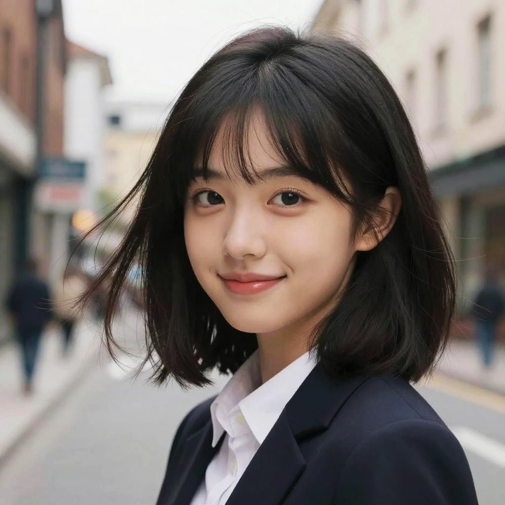 Photograph of an Asian woman with fair skin and straight, shoulder-length black hair, smiling softly. She wears a black blazer over a white shirt. The background shows a blurred urban street with buildings and people walking. Her large, dark eyes and subtle red lipstick add to her gentle appearance. The image has a shallow depth of field, keeping the focus on her face while the street scene fades into a soft, out-of-focus blur. The lighting is natural, suggesting an overcast day.