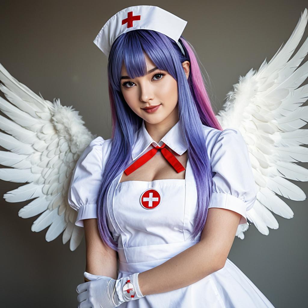 Photo-realistic cosplay photo of person in amane kanata (nurse) costume. 1girl, angel wings, angel wings, purple eyes, blue hair, grey hair, colored inner hair, single hair intake, official alternate hairstyle, streaked hair, official alternate hair length, long hair, pink hair, x hair ornament, twintails, blunt bangs, small breasts, flat chest, nurse cap, white gloves, white dress, white apron, detached collar, puffy short sleeves, virtual youtuber, virtual youtuber, feathered wings, feathered wings, nurse, nurse, bandaged arm, id card, armbandlifestyle stock photo, shallow depth of field, lifestyle stock photography, shallow depth of field, natural lighting, warm tones, soft background blur, candid moments, vibrant colors, realistic textures, modern casual clothing. full body shot