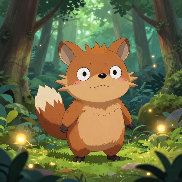 A digital cartoon illustration of an adorable, chubby, orange fox with a white-tipped tail and large, surprised eyes standing in a lush, green forest. The fox has a small, round nose and slightly blushing cheeks. The forest background features tall, dark trees with sunlight filtering through the leaves, creating a serene, magical atmosphere. Glowing fireflies are scattered around the fox, adding a whimsical touch. The fox's fur is fluffy, and it stands with its small arms slightly raised. The overall style is cute and vibrant, reminiscent of children's animation.