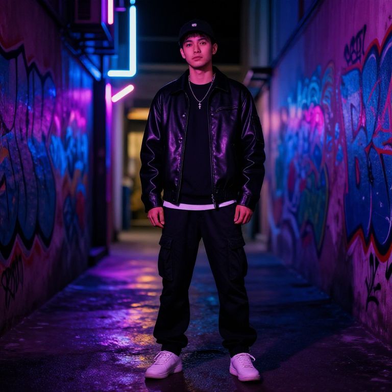 Leather jacket and cargo pants styled in a streetwear look, neon-lit alleyway at night, graffiti walls, reflective surfaces, moody atmosphere, vibrant contrast