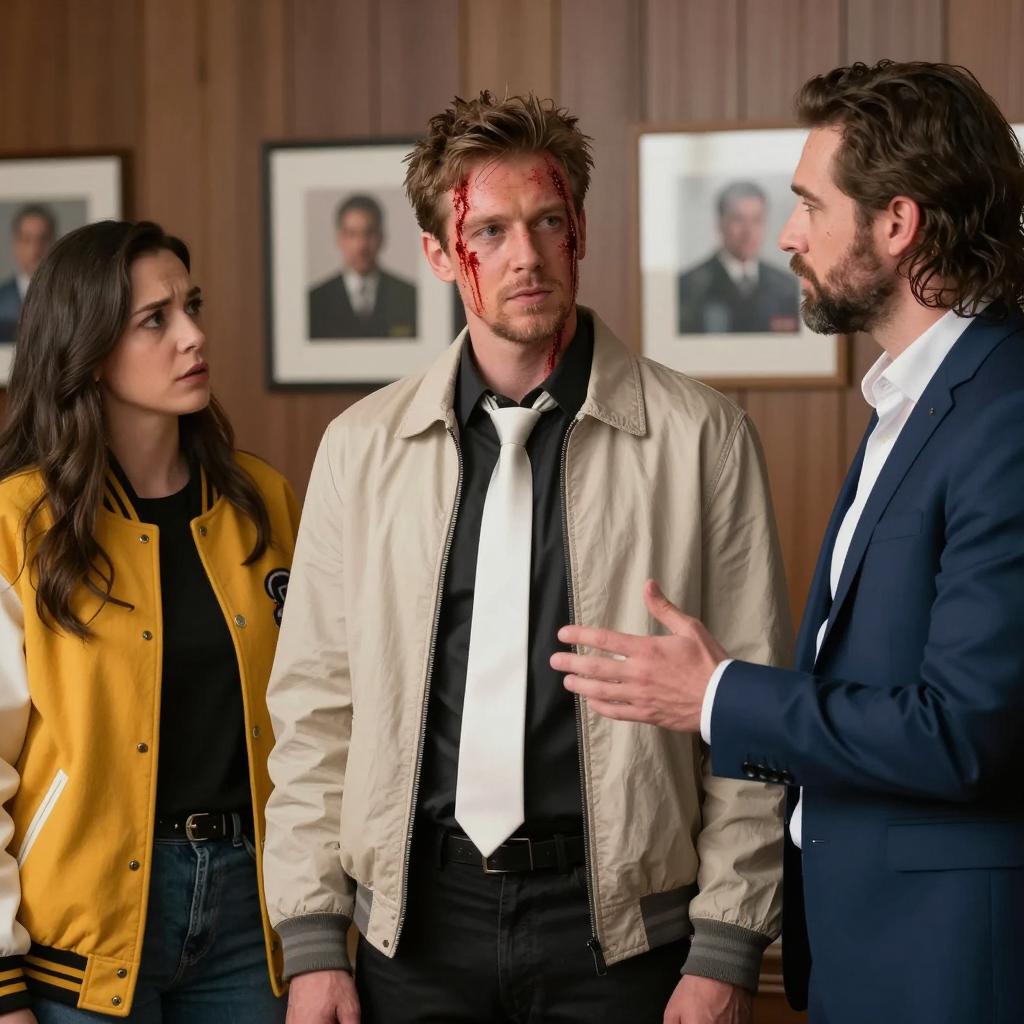 Three people standing inside a glass-walled room. Woman with short white hair, yellow sunglasses, white blouse, black high-waist skirt, blue headphones, holding a blue gun, aiming forward. Middle man with brown hair, beard, brown suit, white shirt, tie, blue headphones, holding a cigar, looking forward. Man on right, black jacket with white graphic, black pants, blue headphones, smiling, looking at the woman. Background: blurred indoor setting with wooden panels and soft lighting.