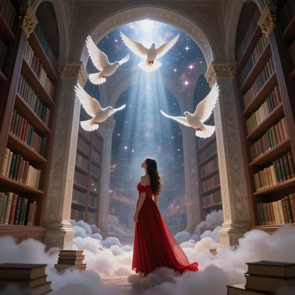 Majestic arches frame a celestial library where three ethereal doves soar through radiant beams of light, while a woman in a flowing red gown stands amidst scattered books and clouds, gazing outward toward the starlit heavens.