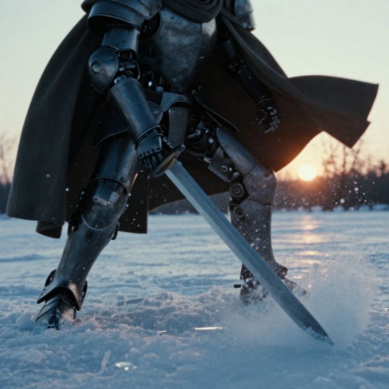 Upper body closeup shot, old grainy analog photo, bad image quality, heavy film grain, monochrome with low key color spots, Create an action scene featuring a mechanical robot Knight in a broad outworn cape, standing in the midst of an ice forest, He is executing a powerful sword strike that carves a furrow through the ice on the ground, scattering them away or disintegrating them with the force of the blow, The warriors stance is calm and cool, with only his silhouette visible against the backdrop of the setting sun, which shines through parts of his metallic body, His billowing Linen cape adding to the dramatic effect, The scene is vibrant with atmospheric lighting and cinematic composition