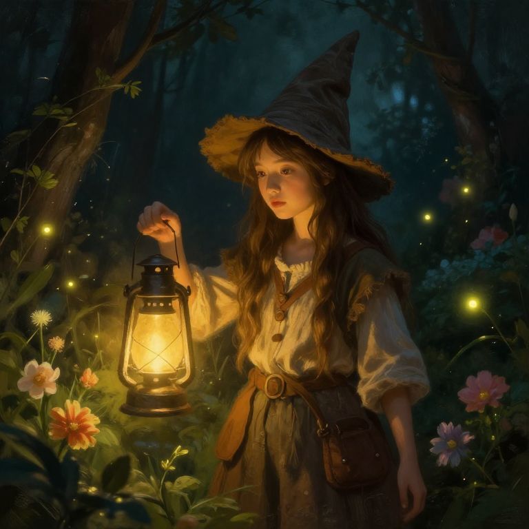 A digital fantasy illustration depicts a young, fair-skinned girl with long, wavy brown hair wearing a pointed witch hat and a white blouse with a brown vest. She holds a glowing lantern in her right hand, illuminating her face and the surrounding forest. The background is dark, with soft blue and green hues, and twinkling fairy lights. She stands amidst vibrant flowers, including pink and orange daisies, and tall grass. The lantern casts a warm, yellow-orange light, creating a magical, ethereal atmosphere. Her expression is serene and focused, adding to the enchanting, whimsical feel of the scene.