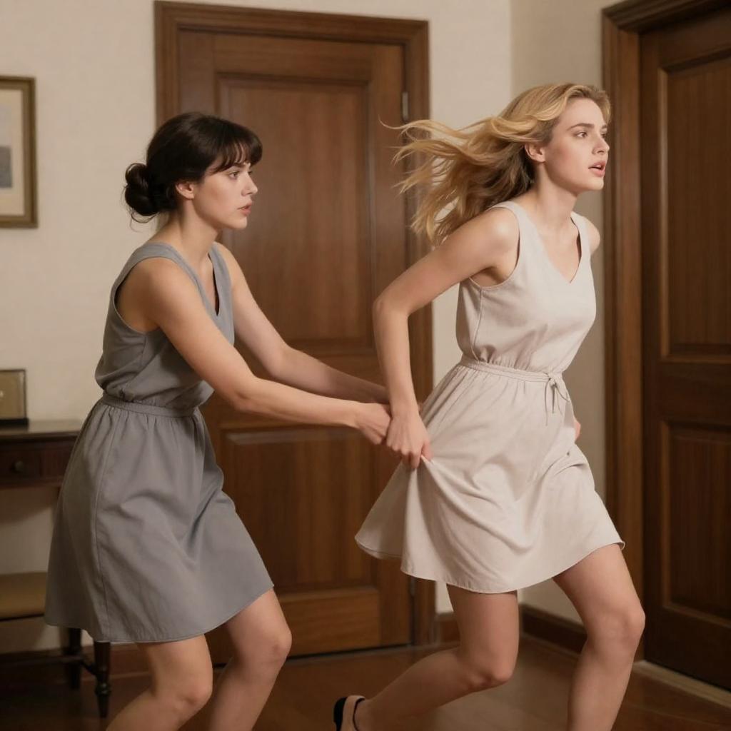 Photograph of two women in a room. One woman in a grey dress, dark hair in a bun, pulls another woman's dress. Blonde woman with flowing hair, light dress, running. Wooden doors in background, warm light, visible furniture. Dynamic motion, intense expressions.
