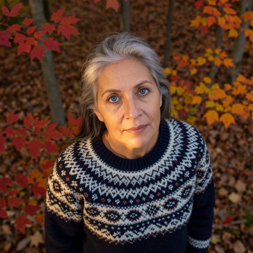 A portrait photograph showcases a wise Hispanic woman with deep blue eyes and silver-streaked hair, bathed in soft golden light filtering through autumn leaves. From an intriguing bird's-eye view perspective, her serene expression in quiet contemplation within a tranquil forest clearing is captured. Surrounded by vibrant reds, oranges, and yellows, the intricate patterns on her traditional Icelandic sweater reflect her warm character. The interplay of light and shadow across her delicate features evokes feelings of peace and introspection, inviting viewers to connect with nature's timeless beauty and the depth of human experience.