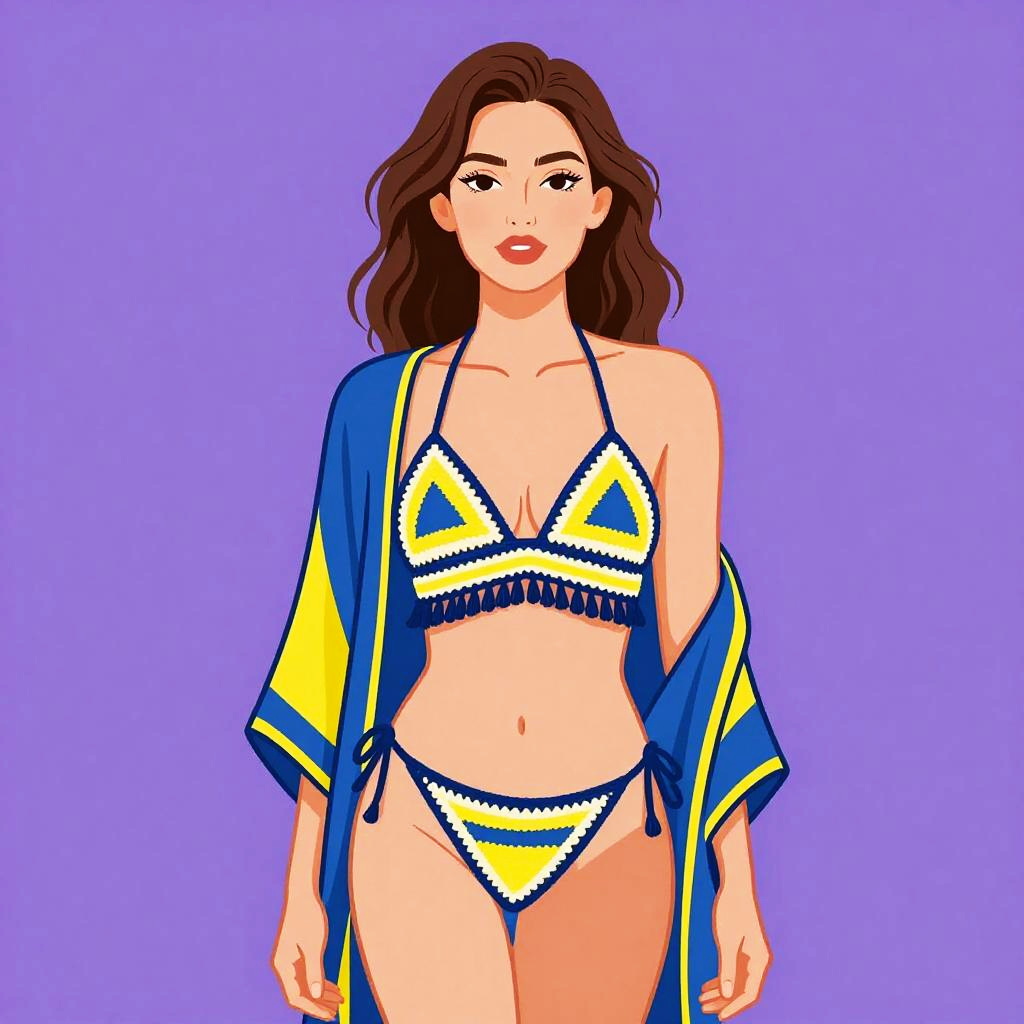 Woman with pretty face and pretty hair. Triangle crochet top, bold geometric designs, durable acrylic blend, deep ocean blue and sunny yellow, flowing beach shawl, breathable cotton, tassel accents, modern chic, great for poolside lounging. --sref 1461
