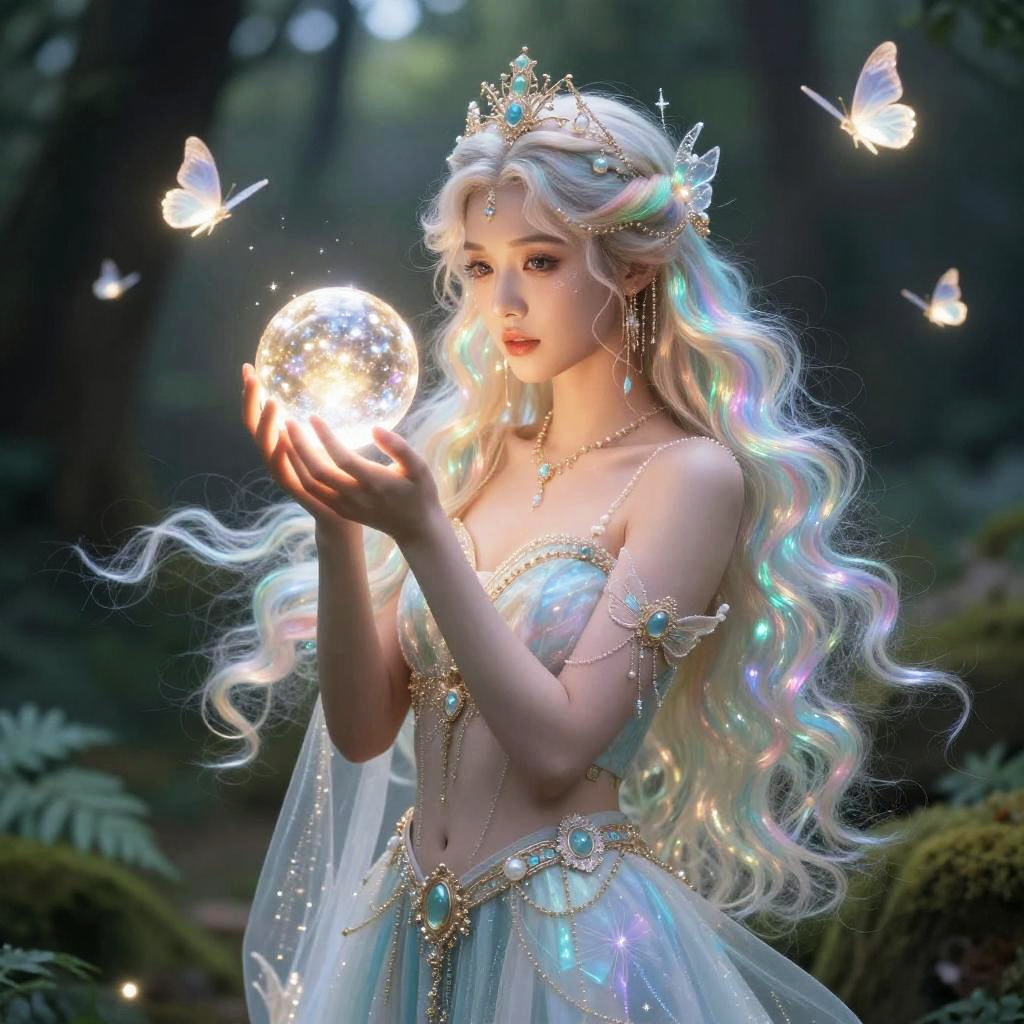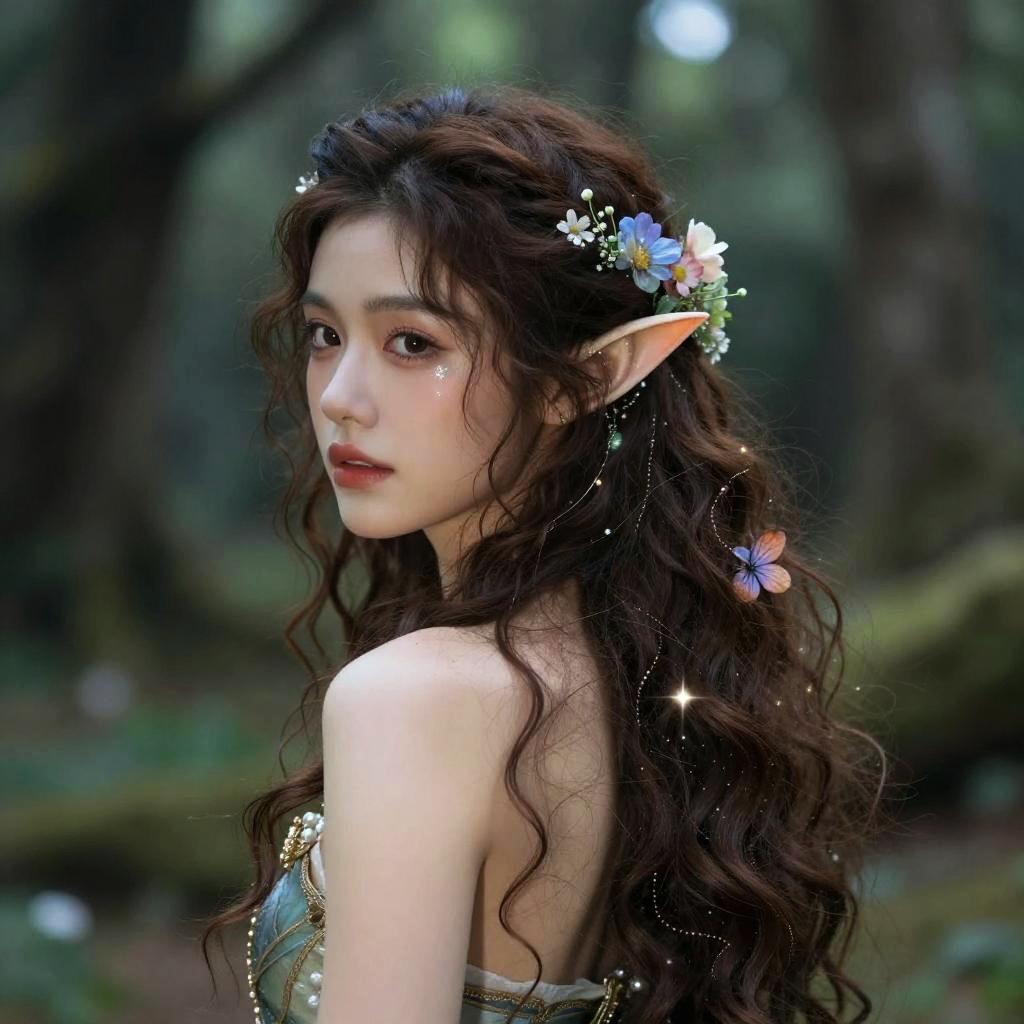 Delicate twilight nymph, with long flowing hair adorned with tiny stars and silver threads, elongated pointed ears, shimmering violet eyes, pale blue skin, surrounded by soft glowing mist, wearing translucent silk dress woven with moonbeams, detailed and atmospheric