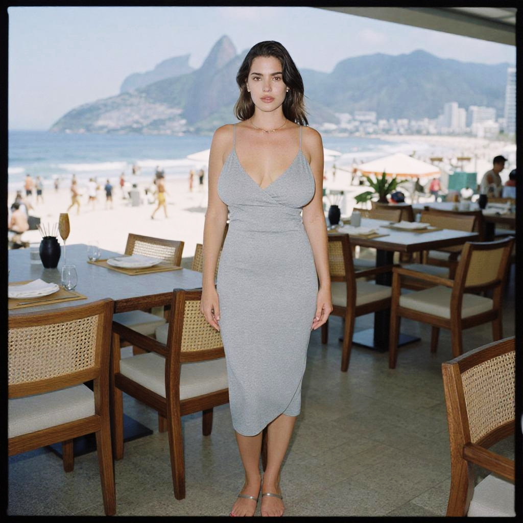 A Voluptuous woman, in a casual summer outfit featuring a cropped white tie-front blouse and floral high-waisted trousers, stands at a Breakfast Stack at a Beachside Cafe, wearing black flat slide sandals, captured in the nostalgic style of a disposable camera. Sexy. Pretty face and beаutiful eyes. Big breasts
