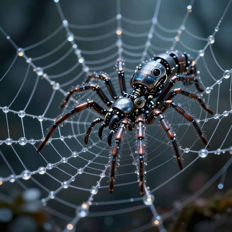 In a realm where dreams intertwine with reality, a mechanical arachnid spins a luminous web of liquid mercury, each thread humming with echoes of forgotten lullabies, weaving a tapestry of melancholic beauty and timeless mystery.