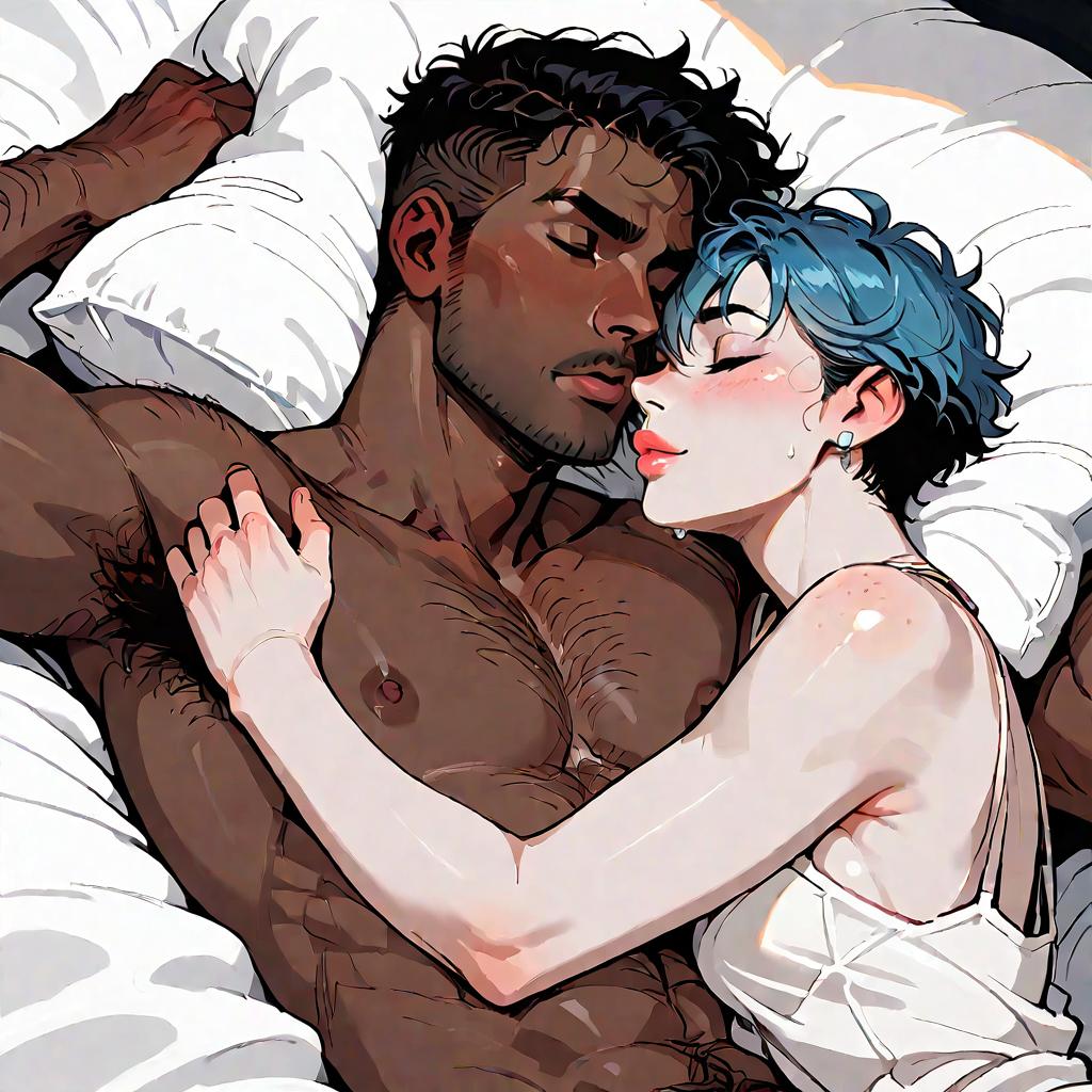 Illustration of a dark-skinned man and a pale-skinned woman lying close together in bed with white sheets. The man has short curly black hair, stubble, and visible body hair, while the woman has short messy blue hair and is wearing a white sleeveless top. Both have their eyes closed and appear peaceful, depicting intimacy and affection.