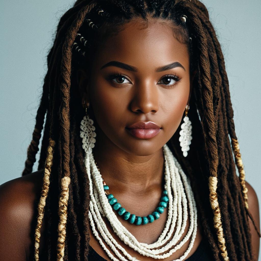 Dark skin woman hairstyle, solo, jewelry, 1girl, earrings, realistic, dark skin, black hair, necklace, dark-skinned female, looking at viewer, turtleneck, portrait, long hair