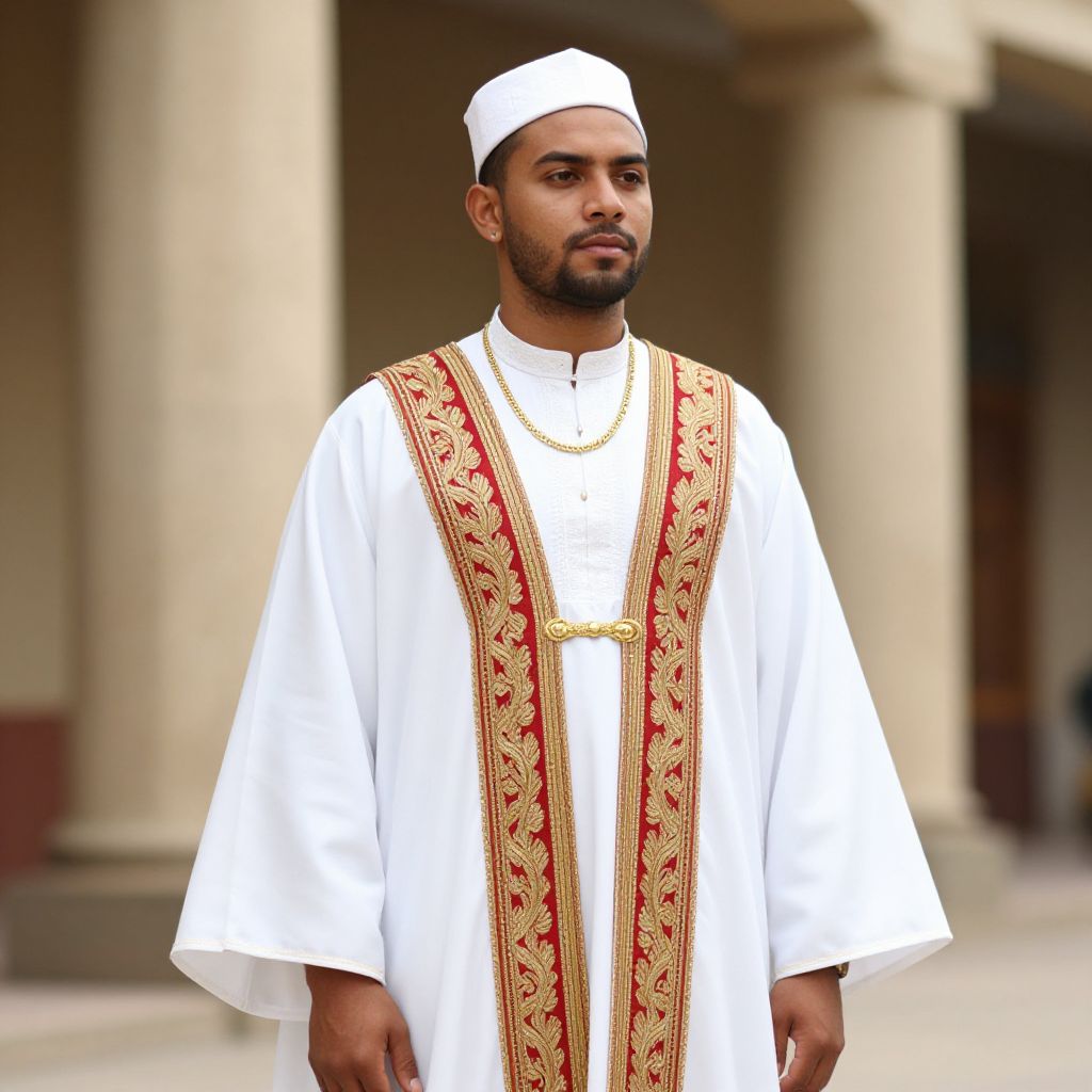 Man wearing a white robe with a red and gold embroidery on the front. The man has a white hat on his head and a gold necklace around his neck. He is standing in front of a building with columns.