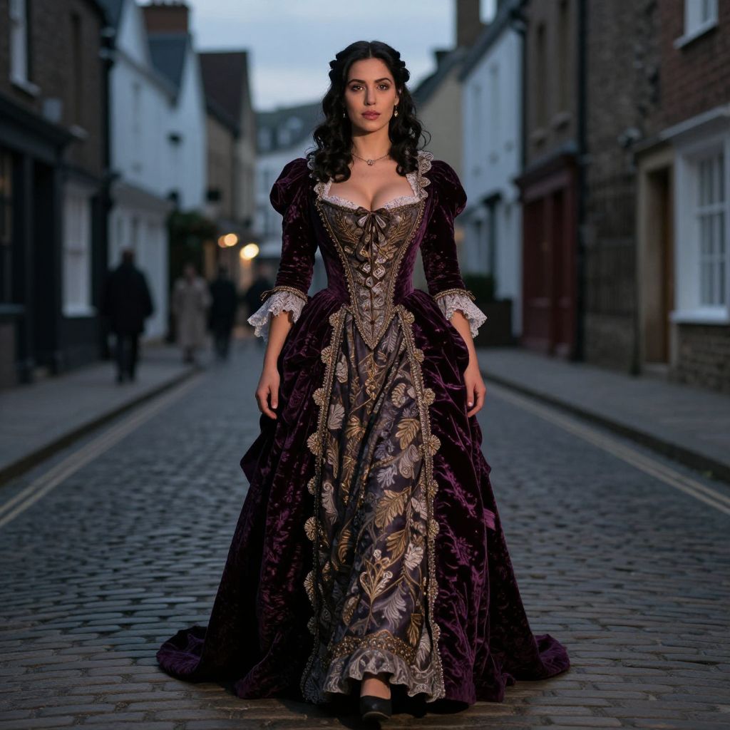A dramatic cinematic-style image of a woman in a Victorian costume dress walking down a cobblestone street in a historic English town at dusk, the dress is fully elaborate with a train, a deep velvet hue, and ornate lace, her face is glowing with soft light, with a determined yet regal look, full lips, and dark wavy hair falling over her shoulders. The woman has big breasts and cute face