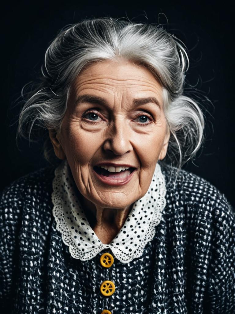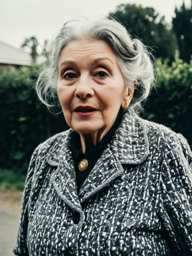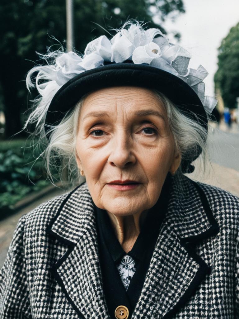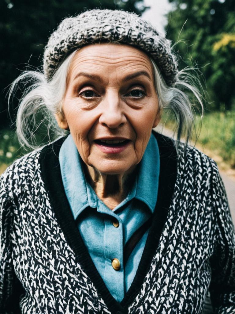 Woman in Crazy Old Lady Costume, photorealistic outdoor portrait, daylight