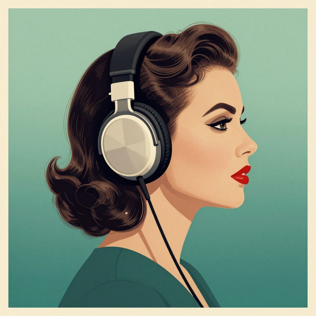 Digital illustration of a 1950s-style woman with dark, wavy hair, red lips, wearing large white headphones, set against a teal background