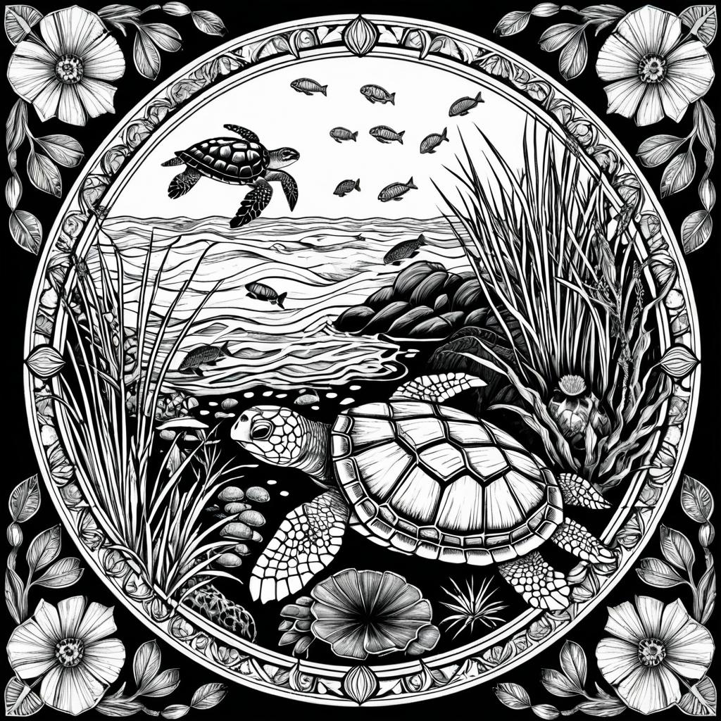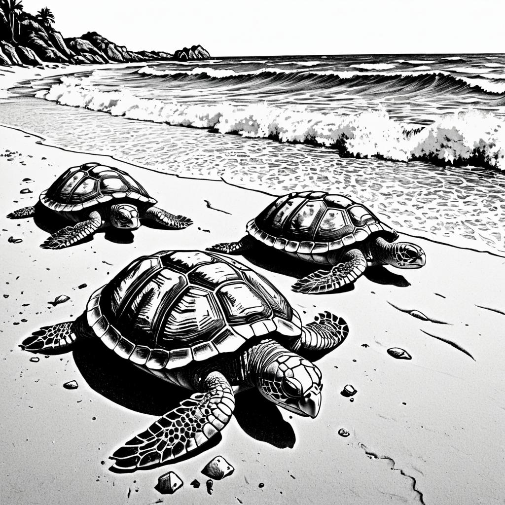 Cinematographer style, ancient turtles and sandy shores, with crashing waves and coarse sand, rendered as an etching print. Detailed line art with thick bold black lines, designed as a colorless adult coloring book page. No shading or grayscale, high resolution, clean and sharp outlines.