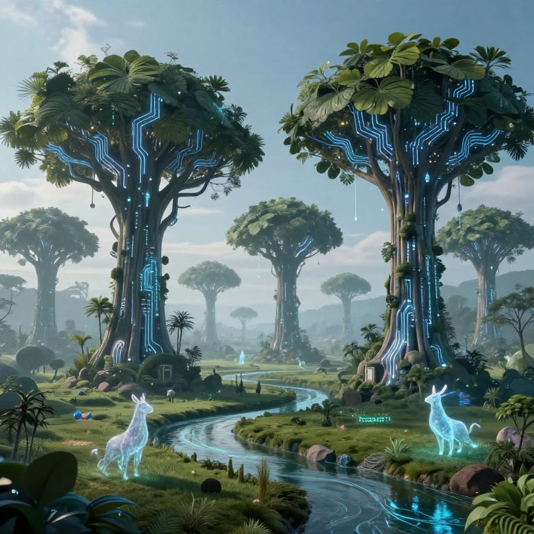 AI generate surreal landscape where nature blends with technology, giant AI trees with circuit board leaves, glowing data streams flowing like rivers, mystical creatures made of code roaming vast plains, fantasy meets sci-fi in a dreamlike composition