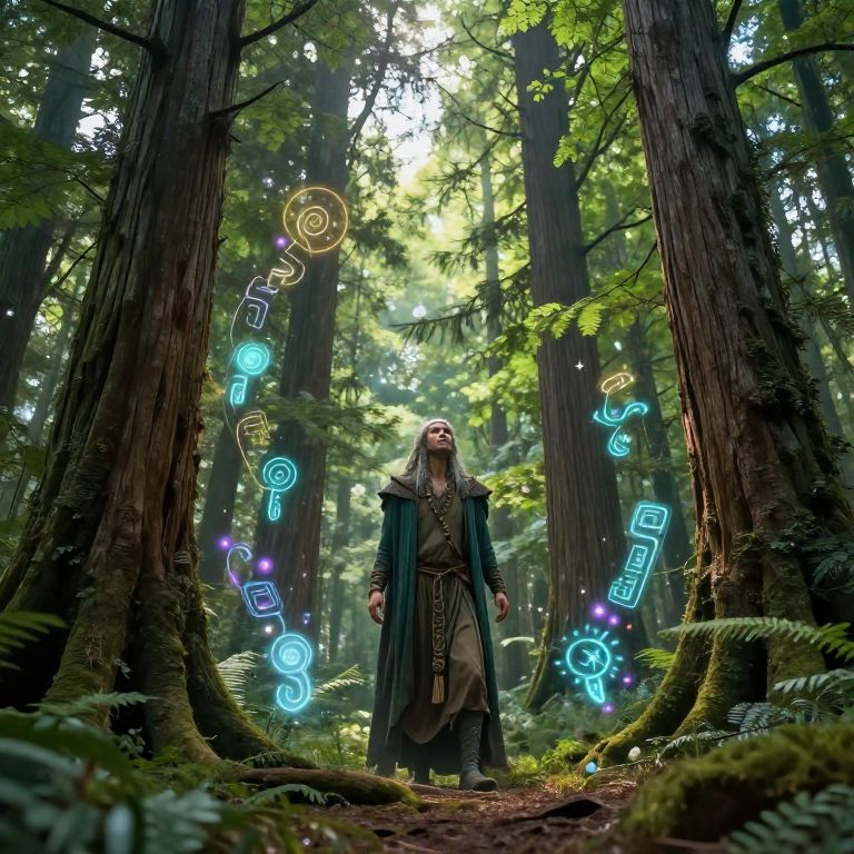 Magical forest scene: tall, hooded wizard with long beard stands amidst glowing blue and yellow runes, surrounded by towering redwoods and lush greenery