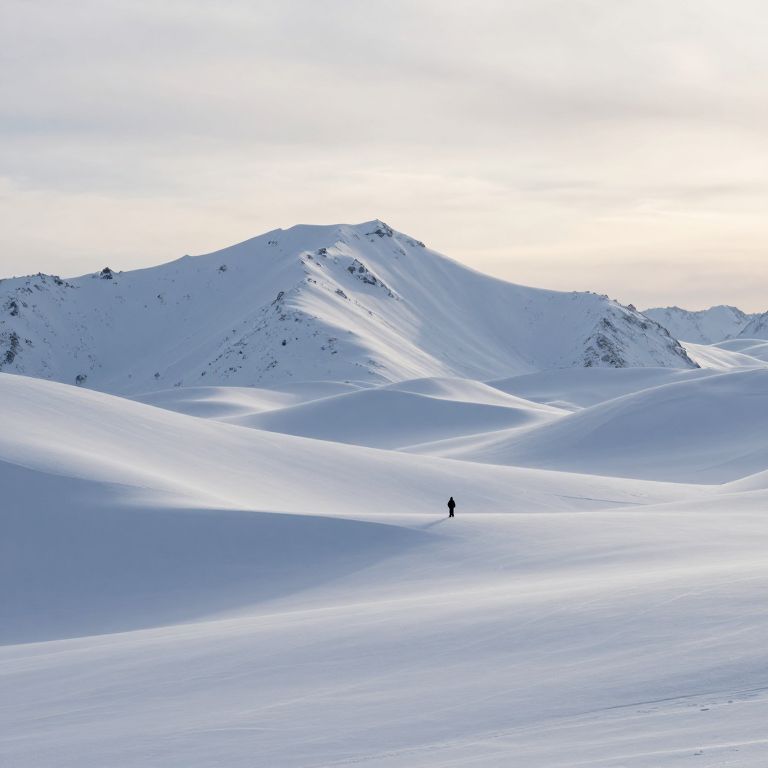 Silent snow-covered peaks rise majestically against a soft, hazy sky, their pristine surfaces undulating like sculpted waves as a solitary figure stands small and distant, dwarfed by the vast, serene expanse of the icy landscape.