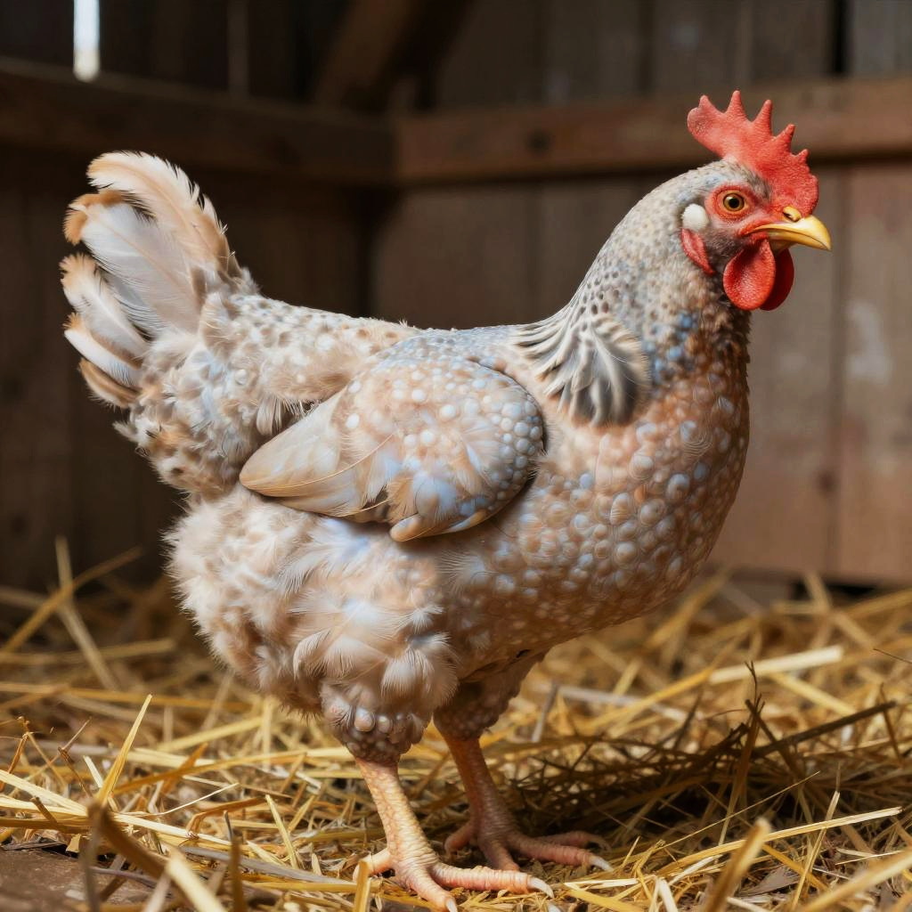 Featherless chicken characteristics captured in a surrealistic art piece, emphasizing the smooth pale skin and robust body shape, intricate textures highlighting absence of feathers, with rustic barn and straw in the background, dynamic lighting with a painterly quality.