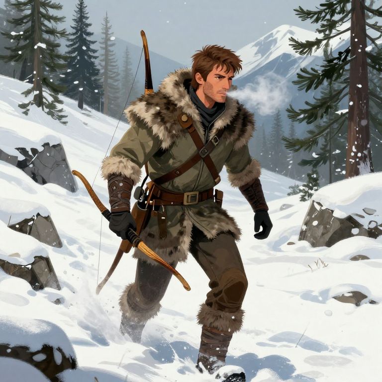 Digital artwork of a rugged, brown-haired man with a beard, clad in a fur-trimmed, dark green winter cloak and black gloves. He carries a bow with an arrow drawn, strapped to his back. He is walking through a snowy, mountainous forest with tall pine trees in the background. The man is wearing brown leather boots and a belt with a pouch. Snow is visible on the ground and rocks around him, with a misty, mountainous landscape in the distance. The art style is realistic with detailed shading and textures.