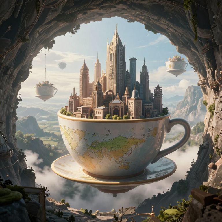 Digital artwork depicting a fantastical scene where a gigantic, ornate teacup with a world map design and a saucer floats in a rocky cave. Inside the teacup is a towering, medieval-style castle with multiple spires and turrets. The background shows a bright, clear sky with floating airships and distant, lush green mountains. The cave's rocky texture contrasts with the smooth, ceramic teacup. Sunlight illuminates the castle's details, casting shadows that add depth. The overall style is hyper-realistic fantasy, blending whimsical and epic elements. The image exudes a magical, otherworldly atmosphere.
