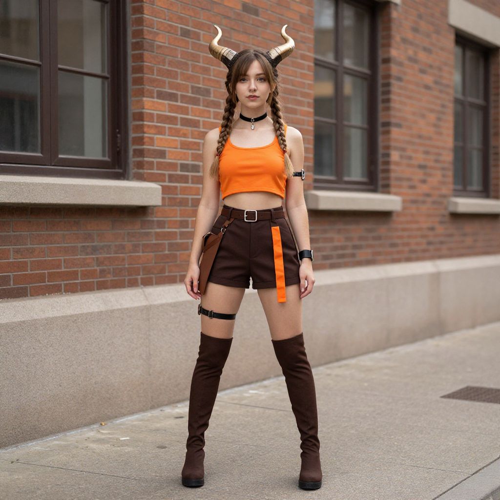 "mythical creatures costume, horns, solo, pointy ears, 1girl, long hair, black hair, standing, tail, full body, looking at viewer, boots Realistic photo of casual sexy person with pretty face"