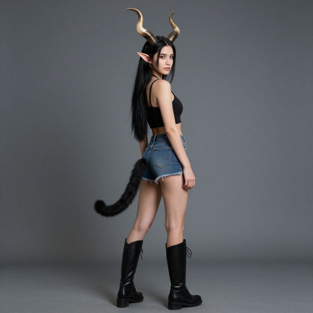 Photograph of a woman with long black hair, elf ears, black horns, black tail, wearing a black crop top, denim shorts, black boots
