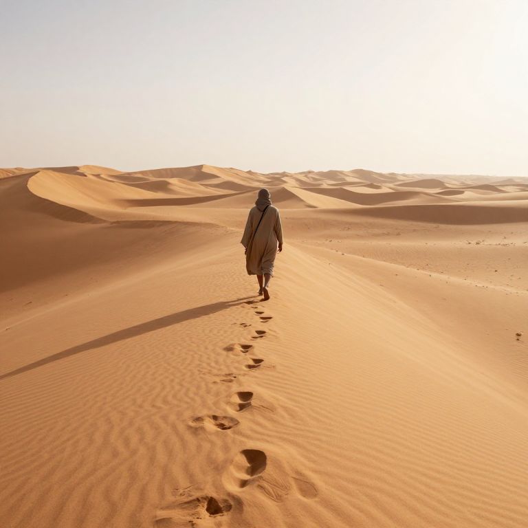 Amidst the golden expanse of shifting sands, a solitary figure walks away, leaving behind footprints that echo the weight of solitude and the quiet resilience of the soul, while the desert whispers ancient secrets and the promise of endless horizons.