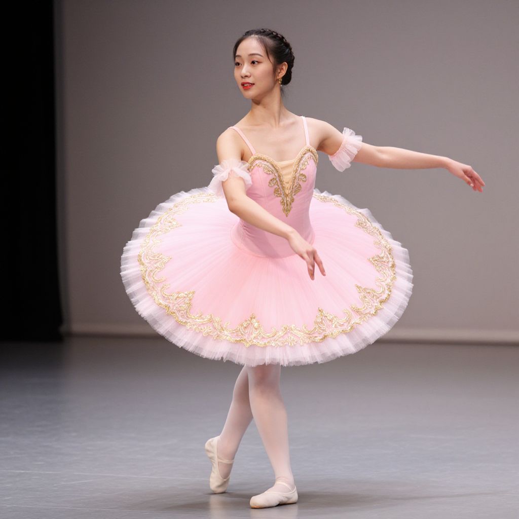 Female model wearing a pink tutu with gold embroidery on the top and bottom. She has a braid in her hair and is wearing a pair of white shoes.